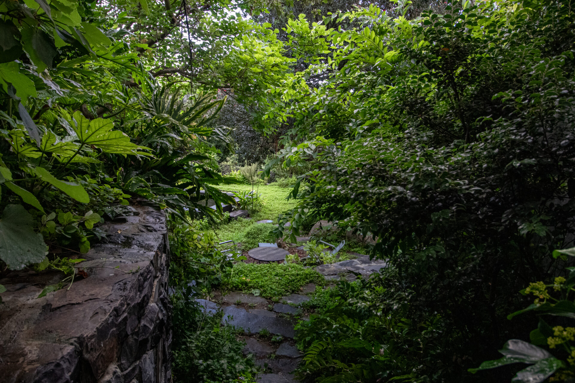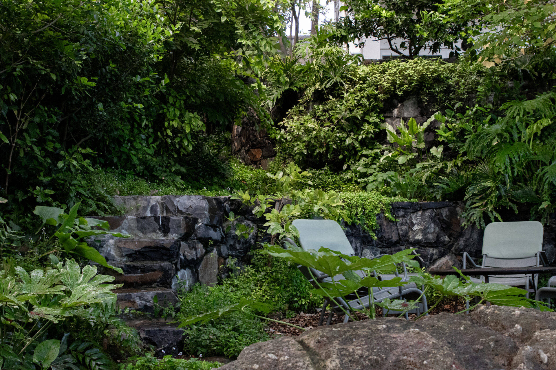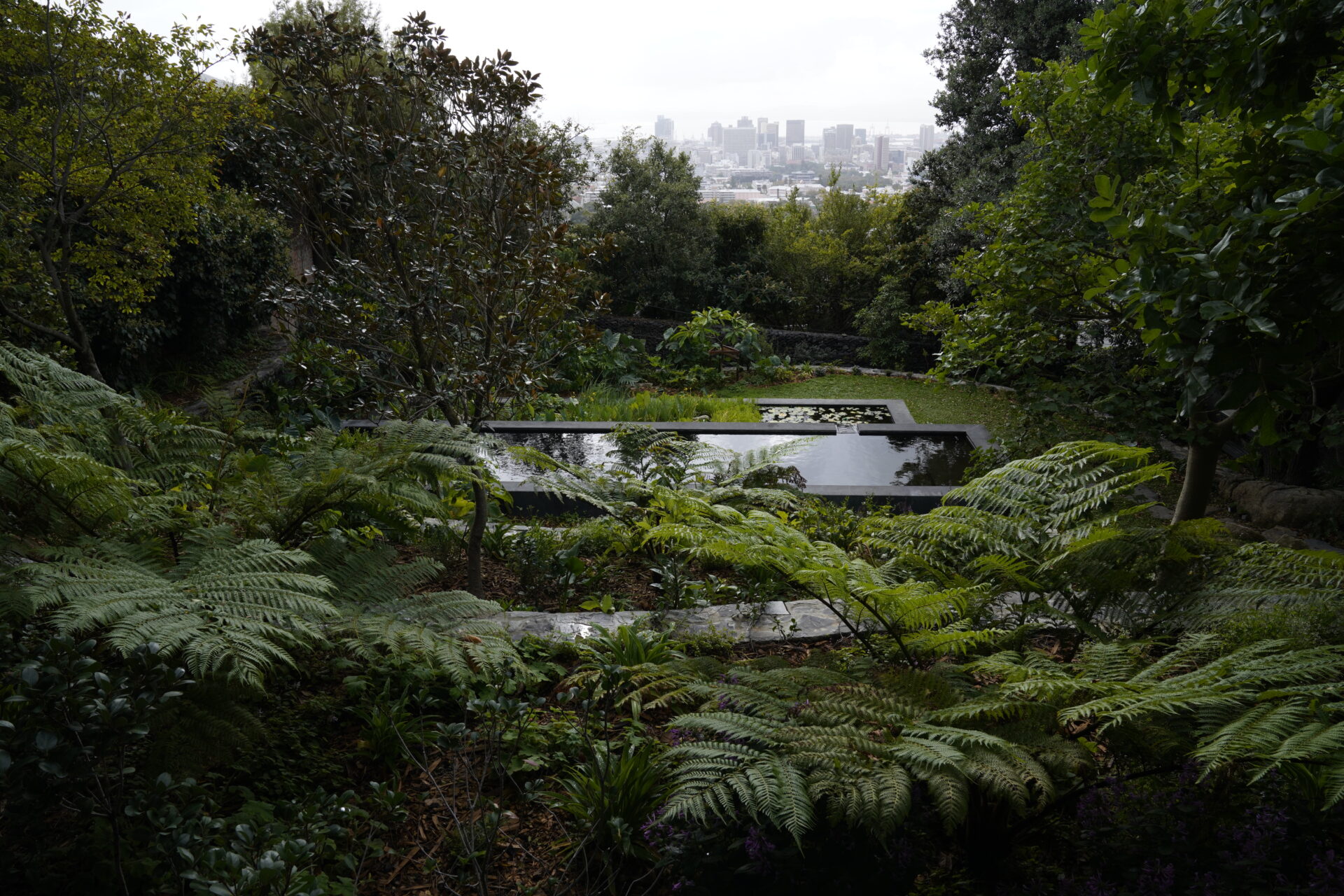 This wild, naturalistic garden on a sloped site in the heart of Cape Town is an oasis for wildlife. Curved stone terraces provide a soft integration of levels that leads one through lush, leafy greenery. The planting ignores the rigid geometry of the property lines and softens the angles of a natural pool below. An abundance of indigenous trees create a sense of seclusion in the heart of the city.