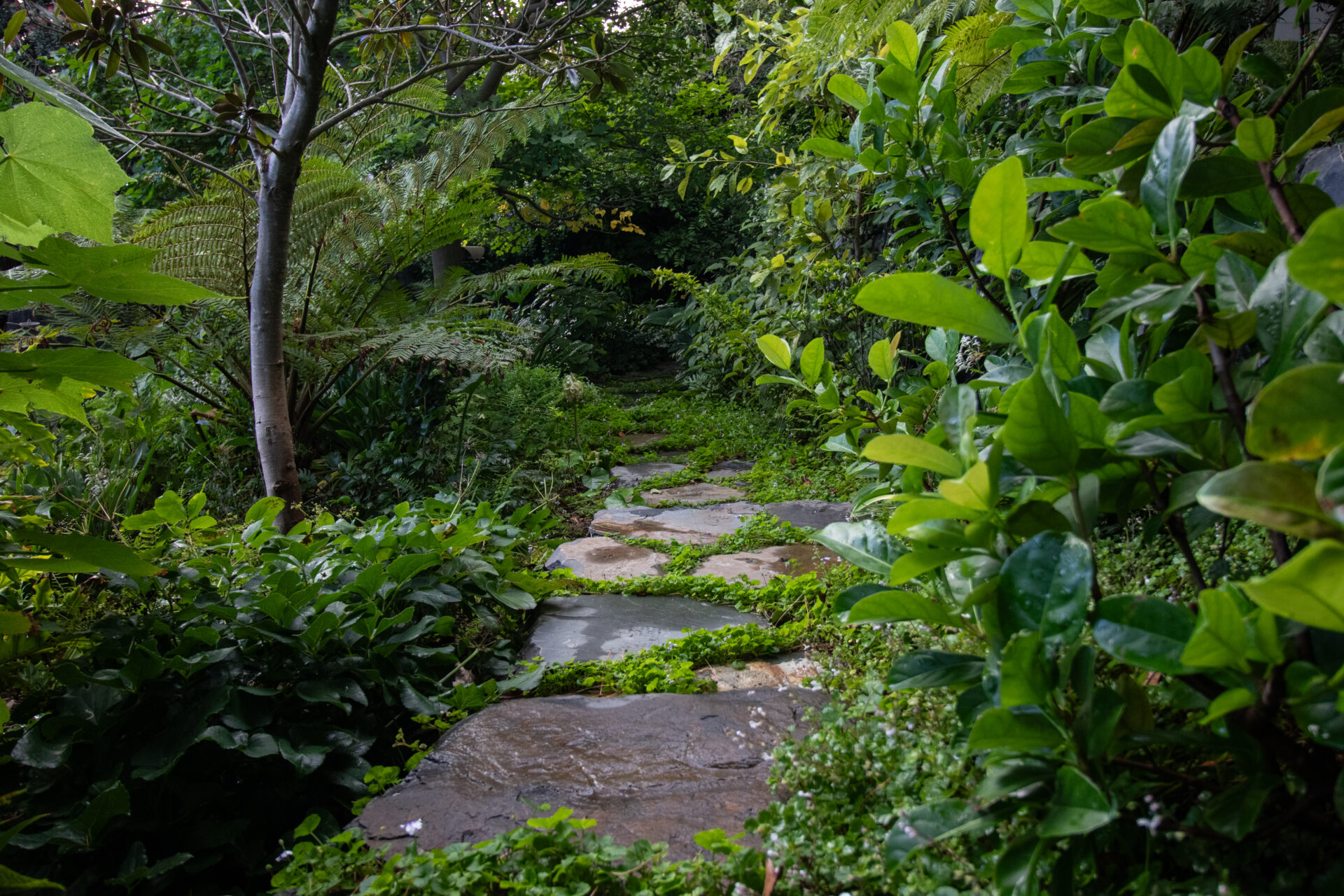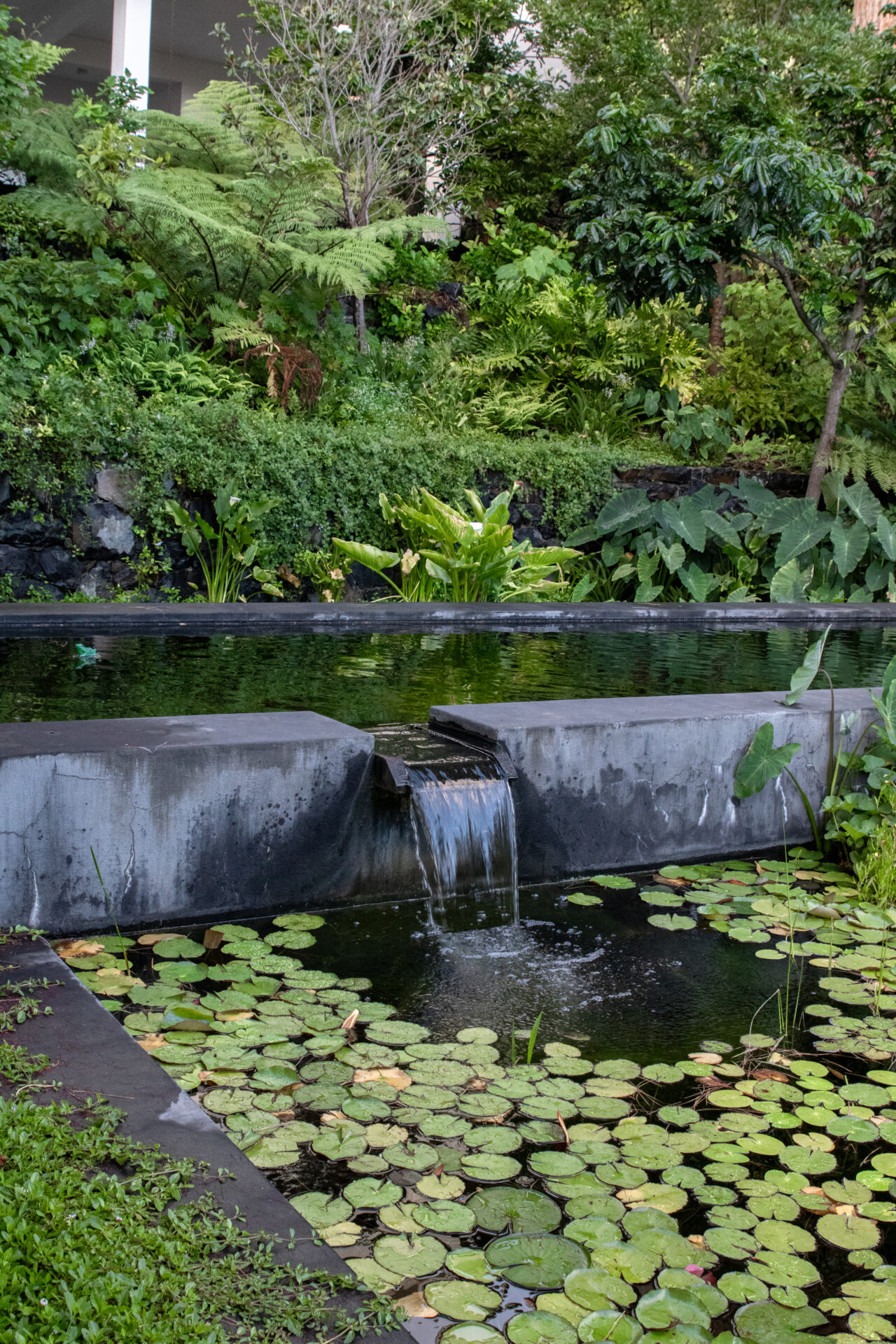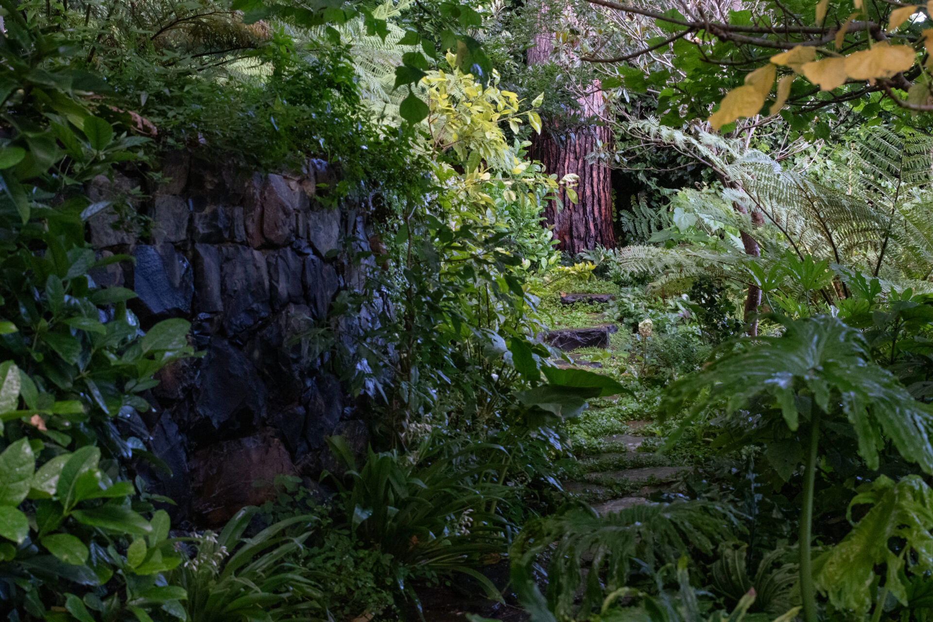 This wild, naturalistic garden on a sloped site in the heart of Cape Town is an oasis for wildlife. Curved stone terraces provide a soft integration of levels that leads one through lush, leafy greenery. The planting ignores the rigid geometry of the property lines and softens the angles of a natural pool below. An abundance of indigenous trees create a sense of seclusion in the heart of the city.
